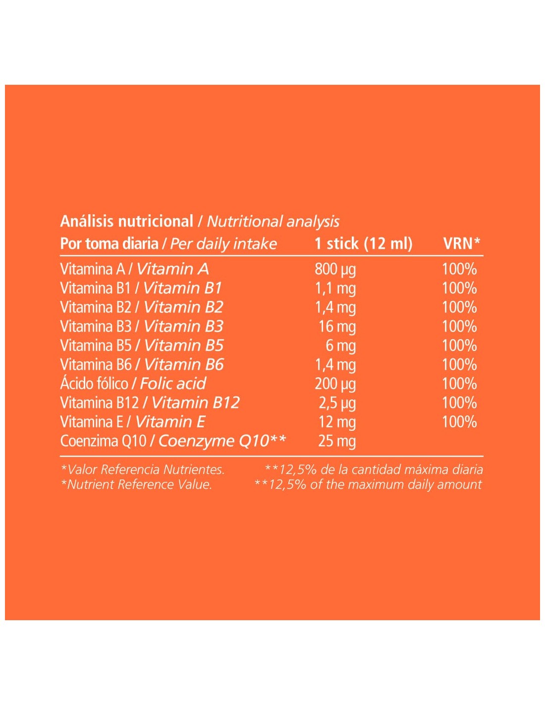 Además, los zumos utilizados aportan una fuente de fibra con efecto prebiótico, esencial para nuestro sistema inmunitario. Por su alto aporte en vitaminas implicadas en el metabolismo energético y su contenido en Coenzima Q10, ejerce un efecto revitalizante.