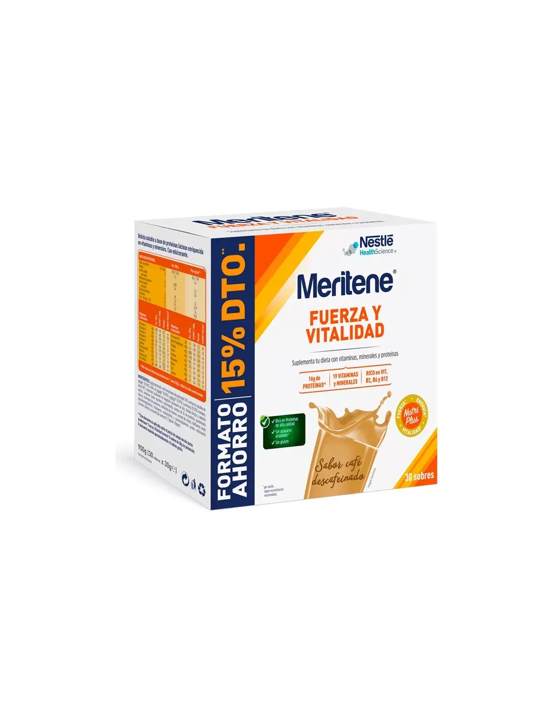 Meritene Fuerza y Vitalidad con sabor a café, están indicados para ayudar a complementar tu alimentación, son una fuente de vitaminas, minerales y proteínas. Este formato ahorro contiene 30 sobres.