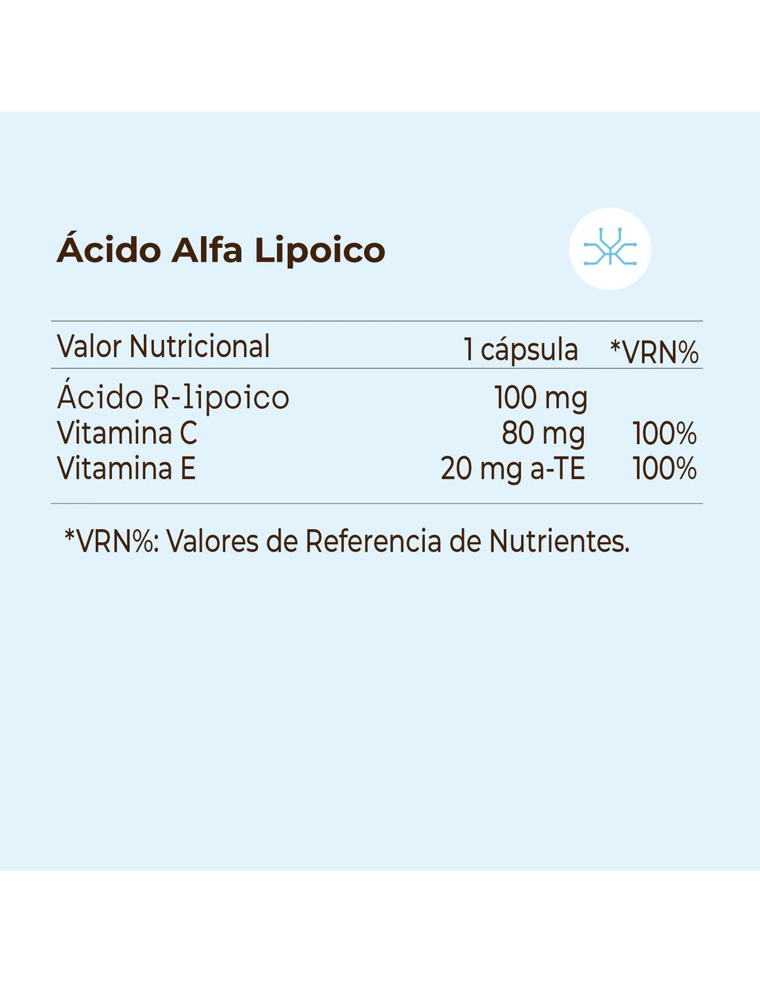 Ácido Alfa Lipoico: Es producido por plantas, animales y humanos. Entre sus diferentes propiedades, destaca por su gran potencial antioxidante. Además, el ácido alfa-lipoico presenta un efecto significativo en la reducción de la glucemia en ayunas y marcadores proinflamatorios (Rahimlou et al., 2019). Se lo conoce a menudo como un antioxidante universal y puede regenerar otros antioxidantes, como la vitamina C y E (Jeffrey, Samraj y Raj, 2021).