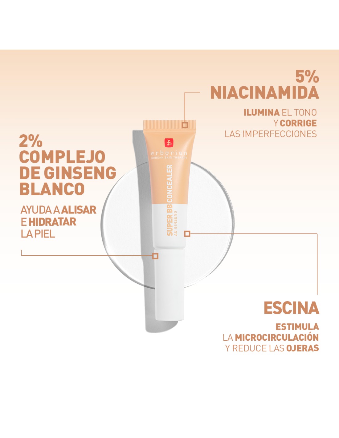 Ojeras vasculares: tienen un tono azulado o morado. Estas ojeras son el resultado de una mala circulación sanguínea y linfática. Gracias a su acción estimulante sobre la microcirculación, la Escina presente en SUPER BB CONCEALER ayuda a reducir visiblemente la apariencia de estas ojeras. Ojeras pigmentadas: de color marrón. Estas ojeras son causadas por una sobreproducción de melanina. Además de factores genéticos, las dos principales causas son la edad y los rayos UV. SUPER BB CONCEALER incluye SPF 25 para proteger el contorno de ojos del fotoenvejecimiento y contiene flor de Ginseng fermentada y un 5% de Niacinamida para combatir la hiperpigmentación.